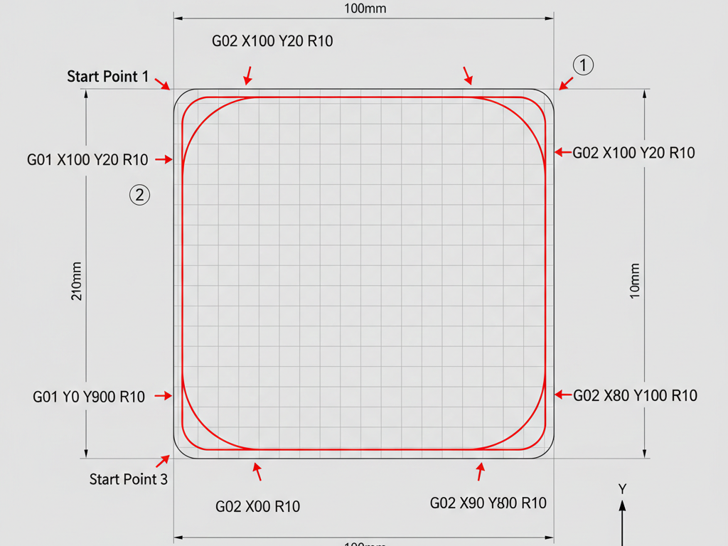 G02 X10.0 Y20.0 R10.0 | CW Arc (Corner 1) |